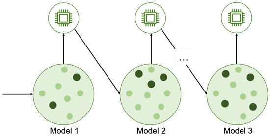 Boosting is an assembly method that combines different weak models into a robust model to minimize training errors. Usually, weak models tend to overfit, so having several additive models allows for a better model. In boosting, a random sample of data is selected, and a model is applied and trained sequentially, where each model tries to compensate for the weak points of the previous one [49], as demonstrated in Figure 6.
