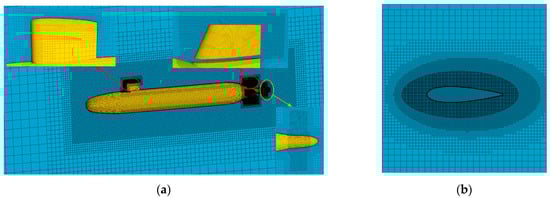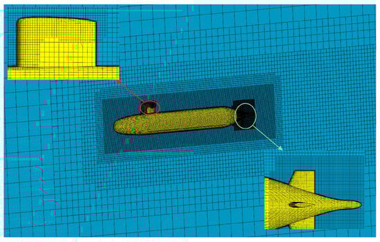 In order to validate the accuracy of the numerical computation method and facilitate comparison with experimental data, the SUBOFF model was simulated at a scale ratio of 1:1. This corresponds to a model length of 4.356 m and an incoming flow velocity of 5.144 m/s. The drag force values from the towing experiment were calculated for reference [30]. This computational grid is presented in Figure 3.