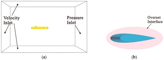 It should be noted that when simulating the model’s six-degrees-of-freedom motion, while the propeller propels the hull’s motion, the rotation of the horizontal and vertical rudders controls the direction of the hull. This is a complex motion system, and at the same time, the propeller, rudder, and vertical fin must move together with the hull. The overset grid technology can independently generate grids for different regions and flexibly handle the relative motion of multiple objects. Therefore, in the simulation process, the rotation motion of the horizontal and vertical rudders was handled using overset grids. In contrast, the submarine’s motion followed a six-degrees-of-freedom motion model, and the propeller motion was simplified using a body force model. This strategy has been validated in [32].