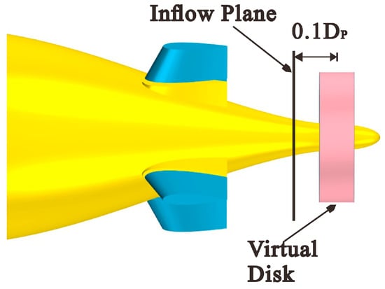 The weighted integration of the flow velocity onto the propeller’s inflow plane provides the propeller’s inflow velocity, which is substituted into the propeller’s known hydrodynamic curve to estimate the thrust and torque. Subsequently, by adding source terms, an equivalent force and moment are exerted on the fluid within the specified volume force field. This method is referred to as the body force model [33]. Compared to conducting actual propeller calculations, this method has a higher computational efficiency. Therefore, the propeller was replaced by a virtual propeller based on the volume force model. This virtual propeller adopts the DTMB 4382 propeller parameters, which are reported in Table 3. Additionally, Figure 6 depicts the virtual propeller’s location within the submarine, the inflow plane diameter of the blade disk (Di = 1.1DP), and the offset of the inflow plane (ds = 0.1DP).