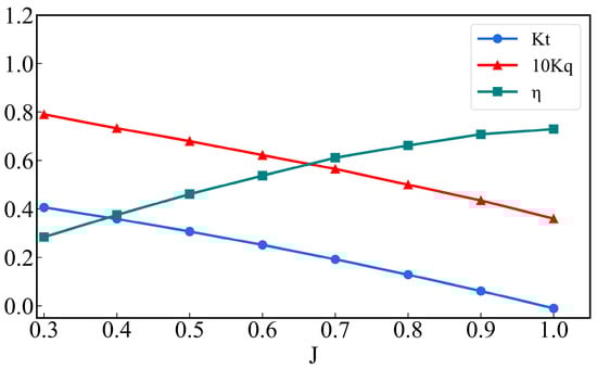 Figure 7 illustrates the open-water performance curve. In order to obtain the same performance as the propeller, its characteristics should be incorporated into the volume force model, where the volume force depends on the thrust coefficient kt and torque coefficient kq. These coefficients are obtained from open-water experiments and are related to the advance ratio J: