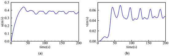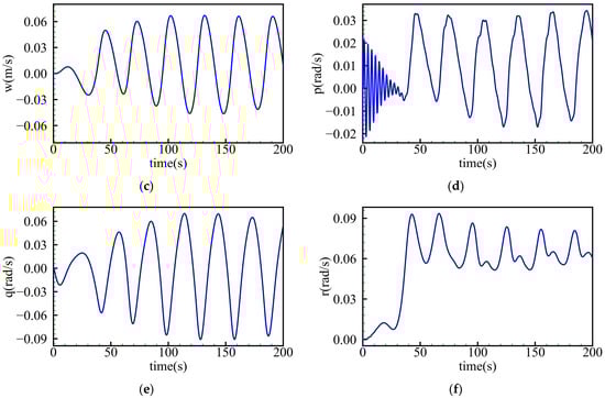 Time history curves of the SUBOFF model’s velocity and angular velocity. (a) X direction velocity u; (b) Y direction velocity v; (c) Z direction velocity w; (d) roll rate p; (e) pitch rate q; (f) yaw rate r.