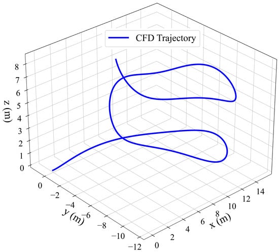 The CFD method was employed to simulate the spatial motion of the SUBOFF model and thus identify its hydrodynamic coefficients. In order to fully activate the model’s motion characteristics, the CFD numerical motion was conducted under some specified operating conditions. Once the model speed is stabilized, the horizontal and vertical rudders continuously steer in a sinusoidal pattern, thereby obtaining the simulated trajectory of the model’s spatial motion, which theoretically allows for the identification of all hydrodynamic coefficients of the SUBOFF model.