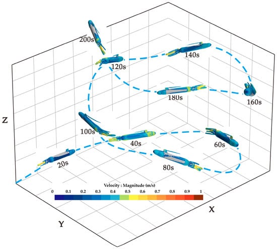During the simulation of SUBOFF spatial motion, the collected velocity and angular velocity data were used to identify the hydrodynamic coefficients. Figure 8 depicts the model’s temporal curves for the velocity and angular velocity in different directions in the body coordinate system. Figure 9 presents an illustrative diagram of the motion trajectory of the SUBOFF model.