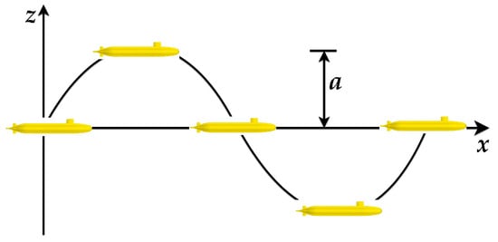 The pure heaving motion of a submarine refers to the motion along its centerline on the vertical plane being uniform while simultaneously having a vertical displacement. The submarine’s heading remains unchanged and undergoes a sinusoidal motion with zero pitch angle. Figure 12 illustrates the concept of pure heaving motion.