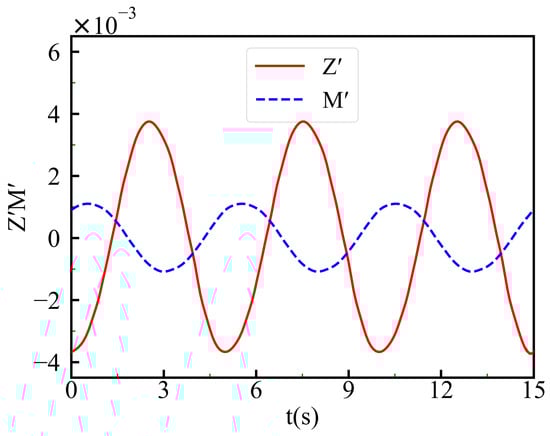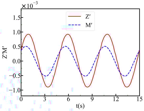 In this trial, the submarine model has a motion with a frequency of f = 0.2 Hz. The simulation calculated data for 6 complete cycles and focused on the stable data from the 2nd to the 3rd cycle. The vertical force (Z) and the pitching moment (M) acting on the underwater body were monitored, with Figure 15 presenting the non-dimensional time history curves of Z and M in pure pitch motion.