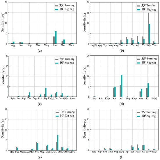 Sensitivity distribution of hydrodynamic coefficients in various directions. The hydrodynamic coefficients in the (a) X direction; (b) Y direction; (c) Z direction; (d) K direction; (e) M direction; (f) N direction.