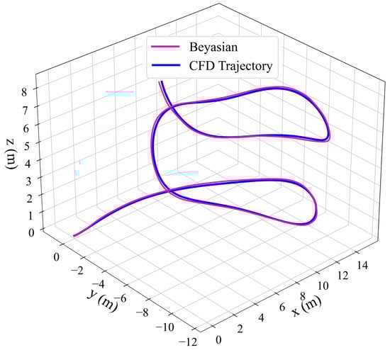 The identified hydrodynamic coefficients were updated in the motion model, and the spatial motion of the submarine was predicted. The vessel’s resulting trajectory was also obtained under the conditions, as discussed in Section 3.2. Figure 17 compares the spatial motion trajectories, showing a high level of overlap, with a maximum error of only 0.22 m. Figure 18 compares the temporal curves of the spatial motion and angular velocity components. Except for the roll angular velocity (p), the deviations within the other motion parameters are relatively small, with a maximum error of 0.089 rad/s for p. Thus, it is evident that using the Bayesian ridge regression model to identify the hydrodynamic coefficients of a submarine yields good results when predicting its spatial motion.