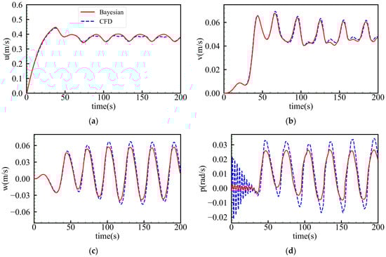 Table 6 compares the hydrodynamic coefficients obtained through Bayesian ridge regression identification and through CFD simulation restraint model testing. Table 6 highlights that the hydrodynamic coefficients obtained using the Bayesian ridge regression model closely match those calculated from the CFD-constrained experiments. The Bayesian ridge regression method yielded hydrodynamic coefficients with most errors within 10%, while few exhibit larger errors, with a maximum error of −43.26%. Based on these findings, it can be concluded that identifying hydrodynamic coefficients through Bayesian ridge regression is feasible. Moreover, compared to traditional CFD methods, the identification method proposed here enables the acquiring of all hydrodynamic coefficients and offers a simple and efficient approach.
