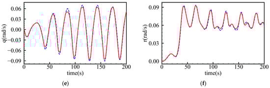 Comparison of time history curves for velocity and angular velocity. (a) X-direction velocity, u; (b) Y-direction velocity, v; (c) Z-direction velocity, w; (d) roll rate, p; (e) pitch rate, q; (f) yaw rate, r.