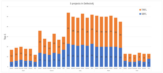 The performance of TRFL and SBFL in terms of TOP-1 score using 6 suspiciousness calculation formulas on 5 projects in Defects4j.
