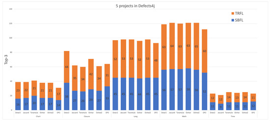 The performance of TRFL and SBFL in terms of TOP-3 score using 6 suspiciousness calculation formulas on 5 projects in Defects4j.