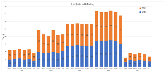 The performance of TRFL and SBFL in terms of TOP-5 score using 6 suspiciousness calculation formulas on 5 projects in Defects4j.