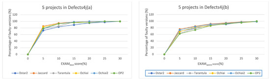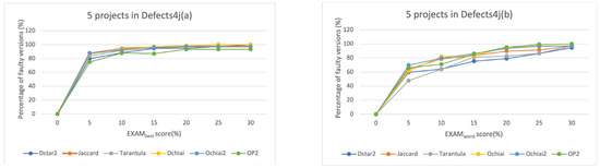 In this case study, the primary task is to explore the overall performance of the proposed method. Six suspiciousness calculation formulas from traditional SBFL methods were used in the experiment to verify the performance improvement brought by using the TrustRank algorithm analysis. Traditional SBFL analysis was performed on five projects that met the requirements of this experiment in Defects4J, and six benchmark performances of fault localization techniques were established for each project. In the comparison process, the benchmark was compared with the best results of the TrustRank algorithm analysis. Since the proposed method requires using traditional SBFL formulas to initialize node weights in PEN and divide seed sets according to these weights, it is necessary to separately evaluate the experimental results using these six SBFL formulas. Here, in order to analyze in detail the best performance of the TrustRank algorithm under different SBFL calculation formulas, experiments were evaluated from several metrics, including the Top-1, Top-3, Top-5, and EXAM. The TrustRank algorithm used default settings, i.e., a = 0.85, and seed sets were controlled at 30% of the total node count. Table 5 presents overall results where different rows represent different effectiveness metrics, and different columns represent projects and suspiciousness calculation formulas used.