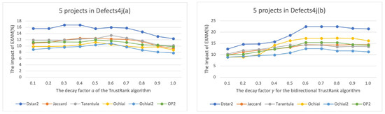 To answer this question, it is necessary to supplement the experimental content with different configurations to study the impact of internal factors of the algorithm and understand how to achieve better performance for TRFL. The extended experimental content is to modify the internal influencing factor of the algorithm, i.e., the decay factor, in order to explore how different decay factors affect the localization effect of the algorithm. In order to highlight the cost of using our experimental method for researchers to find fault locations, only the EXAM is considered as a metric indicator in this case study.