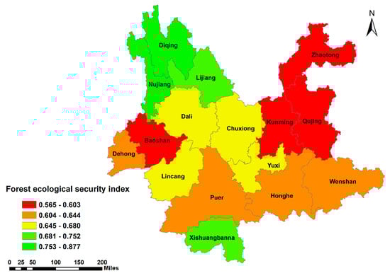 3.4. Forest Ecological Security Index and Its Spatial Distribution