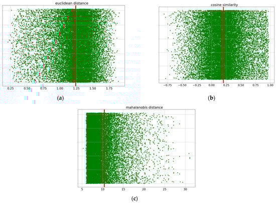 Distribution of data around the threshold for each of the three distance criteria before filtering. (a) The calculated average Euclidean distance of the positive data is 1.245299, denoted by the red line. The data to the left of the red line were deleted to obtain a set of negative candidates. (b) The calculated average cosine similarity of the positive data is 0.20212, shown by the red line. The data to the right of the red line were deleted to obtain a set of negative candidates. (c) The calculated average Mahalanobis distance of the positive data is 10.403354, shown by the red line. The data to the left of the red line were deleted to obtain a set of negative candidates.