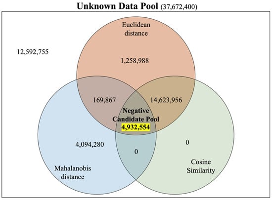 To construct a sophisticated negative set, we utilized three distinct distance measures for filtering within the Unknown Data Pool. The Venn diagram represents the quantities of instances that were filtered as candidates for the negative set according to each distance criterion. As a result, a Negative Candidate Pool consisting of 4,932,554 instances was generated. This signifies that the Euclidean distance, cosine similarity, and Mahalanobis distance are essential for the construction of our sophisticated negative set.