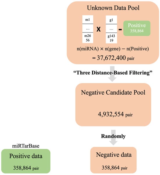 For the positive data set, we employed a subset of experimentally validated miRNA–gene interaction pairs derived from the miRTarBase. To construct the Unknown Data Pool, we generated a comprehensive set of possible interactions by combining all miRNAs and genes used in the positive data set, excluding any pairs that overlap with the positive data set to avoid redundancy. Subsequently, we initiated Three Distance-Based Filtering to establish a Negative Candidate Pool. From this Negative Candidate Pool, we randomly selected a number of pairs equal to that of the positive set to form our final negative data set, thereby ensuring a balanced representation of both classes for the training process.