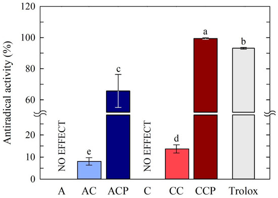 Antiradical activity of chitosan-based solutions. Different letters indicate samples that were significantly different (p < 0.05).