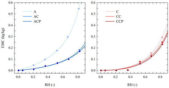 where m is the maximum amount of monolayer water content (kg/kg), K and k are the kinetic constant related to sorption on primary and secondary sorption centers, respectively, w is the ratio of water molecules bound to primary sorption centers and converted into secondary sorption centers, and RH is the air relative humidity (-). The coefficients of the GDW model were estimated using the Levenberg–Marquardt approach. Calculations were performed using STATISTICA 13.3 software (TIBCO Software Inc., Palo Alto, CA, USA).