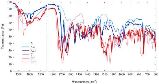Regarding elongation at break, an opposite relationship to tensile strength (TS) can be observed. Samples C, CC and CCP are characterized by the highest elongation at break (EB) for the prepared chitosan films, while samples ACP and CCP are marked by the highest value of elongation at break at 121.87 and 99.4%, respectively. Therefore, the use of citric acid as a solvent has a positive effect on elongation at break and, thus, the flexibility of the sample. For sample CC, where caffeine was applied, there was a decrease in elongation to 34.71%. Samples in which acetic acid was used were marked by lesser elongation. For pure sample A, EB was 35.5%, while samples AC and ACP had elongation values of 6.92 and 10.46%, respectively.