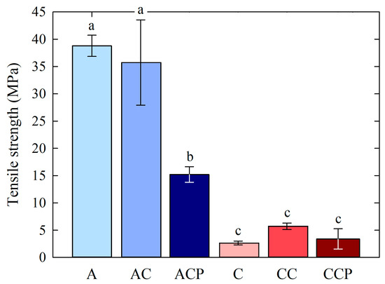 Tensile strength (TS) for prepared chitosan films. Different letters indicate samples that were significantly different (p < 0.05).