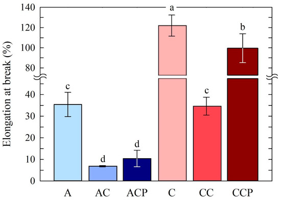 Elongation at break (EB) for prepared chitosan films. Different letters indicate samples that were significantly different (p < 0.05).