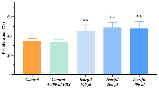 The capacity of the formulation to improve cell proliferation was evaluated using human muscle epithelial cells as a preliminary test. As can be seen from Figure 1, Icarifil was capable of positively and significantly stimulating cell proliferation. Specifically, different amounts of a 0.5 mg/mL solution were tested. It was found that 100 µL of the solution was able to increase cell proliferation by about 22% compared to the control, while 200 µL of the solution was able to increase the degree of proliferation up to 29%; however, the further increase in the amount of the dose of Icarifil did not lead to a significant change in its effect.