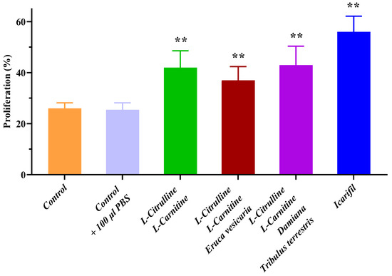 Since good activity was already highlighted at the smallest quantity tested, to avoid toxicity, 100 µL of Icarifil was used to quantify the proliferation of the murine penile muscle epithelium cells. To better understand which of the components present in Icarifil had greater activity, different combinations of it were tested. As shown in Figure 2, Icarifil was able to increase cell proliferation by about 43% compared to the control, whereas various combinations of the components used, although they still showed a positive action on cell proliferation, never achieved an effect above 29%. Different works have reported that the combination of various nutraceuticals provides results superior those compared to single agents, probably due to the synergic effect between the components in the mixture [13,14].