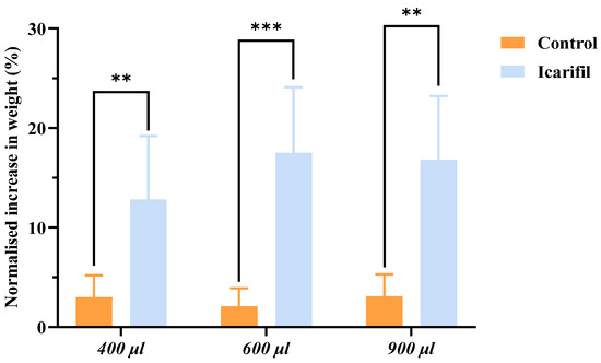Dose-dependent effect of 400, 600, and 900 µL of a solution consisting of Icarifil and culture medium in 1:1 ratio on weight gain of muscle epithelial cells compared with the culture medium used as a control. Data represent mean ± SD with significance ** p < 0.05, *** p < 0.01 using the One-WAY ANOVA test followed by Bonferroni test as a post-test.