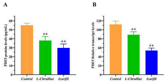 To determine whether the formulation affects the expression of the PDE5 enzyme, human muscle epithelial cells were incubated with Icarifil and L-Citrulline in the same amount present in the mixture. Figure 4 reports the variations in PDE5 protein level and transcriptional levels of epithelial cells after treatment. Icarifil (0.5 mg/mL) was able to reduce the level of human PDE5 in a significantly higher manner than the vehicle used as a control, and L-Citrulline was dosed in an equivalent amount present in the mixture. Specifically, Icarifil showed efficacy in reducing PDE5 protein levels higher than L-Citrulline by 22% and 45% compared to the control. This difference further increased when transcriptional levels of PDE5 were evaluated, where the total mixture was more effective than L-Citrulline alone at levels of about 40%. It is clear from these data that when L-Citrulline is used in combination with the other component in a unique formulation, the efficacy on the PDE5 enzyme is more evident than when it is used by itself [28].
