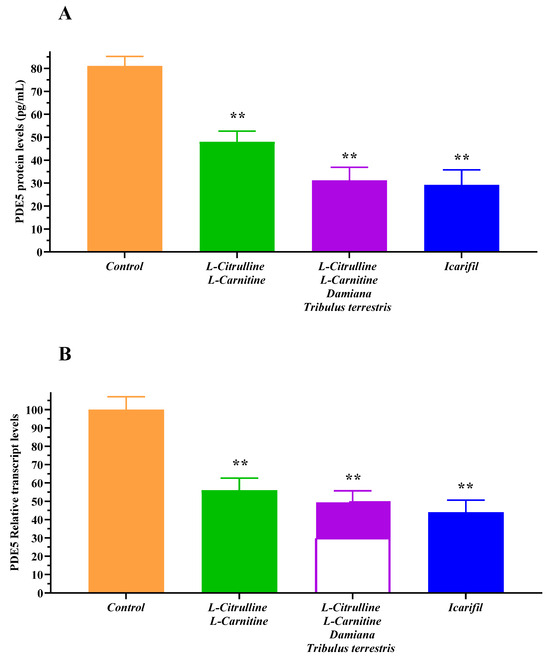 To verify whether these results translated into mouse penile muscle cells, the cells were incubated with Icarifil or components comprising the formulation. The results showed that Icarifil (0.5 mg/mL) was able to reduce the activity of phosphodiesterase type 5 significantly more effectively than the control and the mixture of L-Citrulline and L-Carnitine alone or in combination with Eruca vesicaria, Turnera diffusa, and Tribulus Terrestris, dosed in an equivalent ratio to that present in the mixture (Figure 5A). Specifically, the total mixture showed efficacy in reducing PDE5 levels higher than 65% compared to the control and 35% compared to the mixture of L-Citrulline and L-Carnitine, the major components of Icarifil. This difference was also evident in the relative transcriptional levels of PDE5 (Figure 5B), where Icarifil was substantially more effective than the control (about 57%) and the mixture consisting of L-Citrulline and L-Carnitine (about 22%). These results could be explained by the synergic effect between the components of the multicomponent mixture, demonstrating that this complex mixture could reduce PDE5 levels more effectively than the single components.