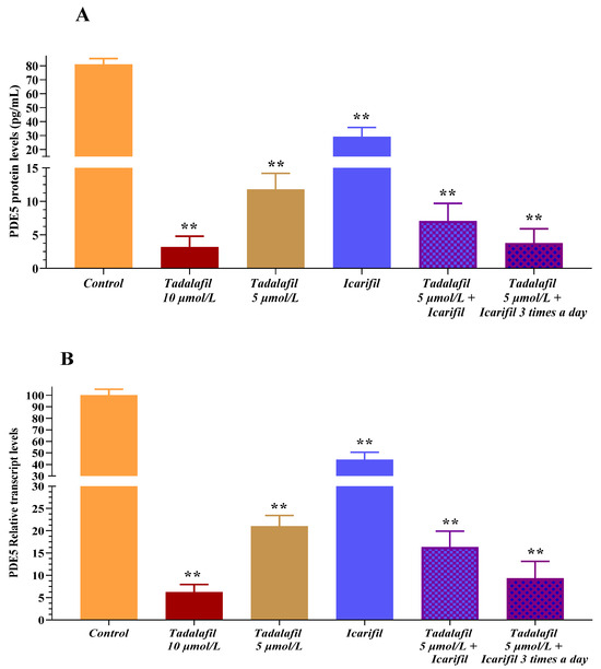 After assessing the ability of Icarifil to reduce the activity of PDE5 enzyme more than the single extract, its activity was compared with a well-known PDE5 inhibitor. Therefore, mouse penile muscle cells were treated with an aqueous solution of tadalafil alone (10 µmol/L and 5 µmol/L) and in co-treatment with Icarifil (0.5 mg/mL). As can be seen in both panels of Figure 6, the capacity of tadalafil to reduce PDE5 protein and transcriptional levels at both tested concentrations showed significantly superior results compared to the control and Icarifil, where the highest concentration (10 µmol/L) was able to return an inhibitory response more than double that of the lowest concentration (5 µmol/L) and more than four times higher than Icarifil at 0.5 mg/mL. However, it is interesting to note that, when Icarifil was co-administered with 5 µmol/L tadalafil, a synergistic effect on PDE5 was exhibited. In fact, the administration of Icarifil three times a day in association with tadalafil administered once a day was able to reduce the activity of the PDE5 enzyme, as shown in Figure 6. In fact, this association led to activity being registered when tadalafil was administered at a concentration of 10 µmol/L. The presence of Icariina in Icarifil located near the entrance of the PDE5 active binding site modulates the affinity of this enzyme for its ligand [29]. Moreover, Citrulline and Carnitine administered together with PDE5 inhibitors are able to increase the efficacy of inhibitors on PDE5 [13,30].