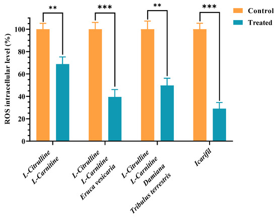 Reactive oxygen species (ROS) act as one of the important mediators in the pathophysiological process of ED. Studies have shown that increased ROS reduces NO production or bioavailability, leading to impaired endothelial function and erectile function [31]. Therefore, the intracellular levels of ROS generated by oxidative stress due to the addition of a citral solution to cells were quantified. As shown by the data reported in Figure 7, this induction was significantly reduced when the cells were pretreated with Icarifil or with different components of it before the treatment of citral. This effect was greatest in the case of Icarifil, capable of counteracting the formation of ROS by about 70% compared to the control, whereas the individual mixtures, also due to the quantity of the various antioxidant agents present, proved capable of reducing the levels of ROS at the intracellular level by a maximum of 58%, as in the case of the mixture composed of L-Citrulline, L-Carnitine, and Eruca vesicaria. However, the mixture presented better activity thanks to other nutraceuticals, Vitamin E, Taurine, and Zn, which, acting as an antioxidant, may have suppressed testis oxidant enzyme activity and testosterone synthesis, blocking oxidative stress [32]. Hence, it seems plausible that a new formulation containing antioxidant elements could have a beneficial effect on ED, reducing the risk of ROS-mediated damage.