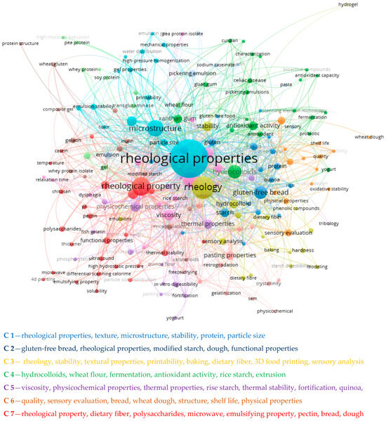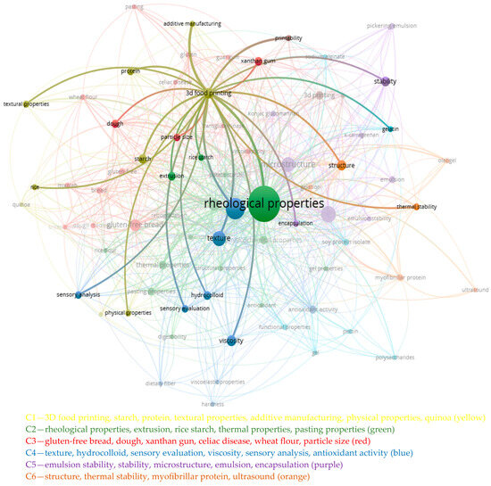 The use of bibliographic analysis allowed us to highlight the role of the components that make up the food mass for 3D printing. The sensory properties, texture, and structure of 3D printed foods play an important role in the acceptance of 3D food products, so their connection with the main technologies used and possible improvements in quality properties by incorporating enriching components into the final food product are shown. In different clusters, a large number of small rings can be seen, indicating substances that provide the structure of the design—starch, pectin, gluten, etc. In order to ensure the desired sensory performance, coloring agents are used, in particular, to ensure the overall acceptability of the final product (C6), as well as enrichment agents that provide the appropriate nutritional value to the printed food (C2, C4, and C7).