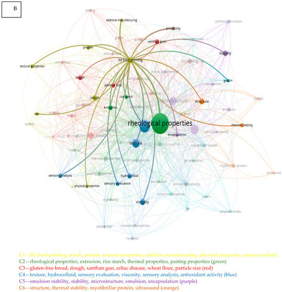 It is obvious (Figure 1) that the rheological properties of printed gluten-free food products are key, as indicated by the repeated use of keywords such as “rheological properties”, “rheology”, “texture”, and “viscosity” (C1, C2, C3). This fact also proves that food products, including gluten-free ones used for 3D printing, must have constant rheology and texture to obtain a high-quality final product. Therefore, this highlights the need to analyze the suitability of the proposed printable mixtures, rheological properties, and specific chemical composition of the raw materials when developing gluten-free food material for 3D printing.