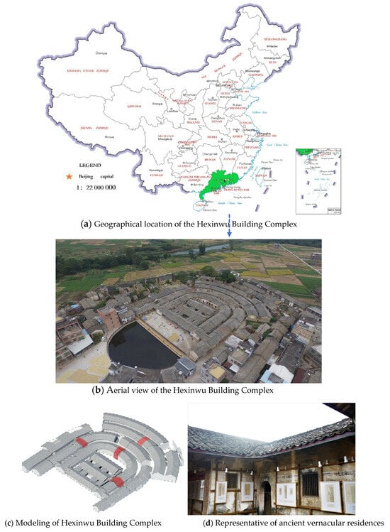 The Hexinwu Building Complex is a landmark complex with a history of more than 350 years located along the ancient southern Guangdong Road, east of Lianping County, Heyuan City, Guangdong Province, China (see Figure 1a). Built as a battle site during the People’s Liberation War, Hexinwu is home to various intangible cultural heritages such as red culture, contract culture, and Hakka culture. It also serves as a heritage revitalization practice base in Guangdong Province. The complex boasts a symmetric courtyard house structure featuring an axial main hall in its center. In 1724, the He Xin House was built in five circles with five gates and nine wailing dragons, divided into four pavilions: east, west, north, and south. The existing Hexinwu building complex has only four circles, as shown in Figure 1b,c. The highest point of this structure is the wailing apex, followed by the upper hall, middle hall, and lower hall, which successively descend in formation, separated by patio and screen divisions. Horizontal houses that flank the main halls are arranged perpendicularly in overlapping patterns toward both sides, forming the core unit across (see Figure 1d). Given its important role in studying traditional Chinese architectural art and transmitting ancient cultural customs among people, the Hexinwu Building Complex offers high cultural value.