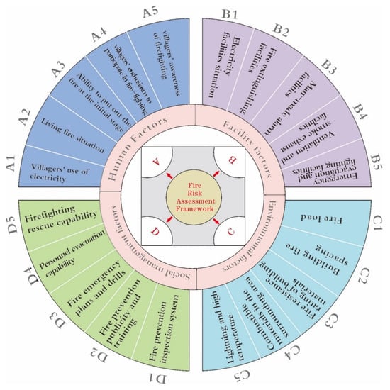 The most important aspect of risk assessment is the implementation of an indicator system. Using data from prior research, the fire risk assessment system for the Hexinwu Building Complex was constructed by combining human factors, facility factors, environmental factors, and social management factors, which created a full system of twenty sub-indicators [,,]. See Figure 2 for more information. Subramaniam [] showed a statistically significant positive correlation between human factors and the occurrence of fire. Ouache et al. [] reconciled any discrepancies by applying evidence-based reasoning and machine-learning methods to illustrate that human error was responsible for 20.68% of urban fire events. In this research, in view of the possible incompleteness, diversity, and complexity of historical fire data from ancient village buildings, which vary according to geographical and cultural differences, the fire risk assessment model focuses on the principles of operability and data reliability in addition to the principles of comprehensiveness and methodological scientificity. The framework of fire risk assessment was established, as shown in Figure 2.