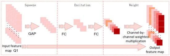 where , and represent the squeeze operation, the excitation operation and the weight operation, respectively; H and W are the height and width of the input feature map , respectively; the value of i is in the range of [0, H], and the value of j is in the range of [0, W]; represents each feature channel; s represents the true number after the Squeeze operation; represents the Relu nonlinear activation function; represents the total parameters of the FC operation; , and g represent the parameters of the FC operation, respectively; represents the Sigmoid activation function performs the weight normalization operation on each feature map; and represents the weights obtained from the Excitation operation.