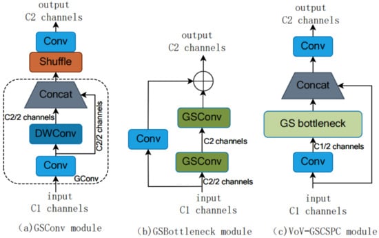 In this work, the GSBottleneck module and the single aggregation module VoV-GSCSPC are further used on top of GSConv module, as shown in Figure 4b,c, where GSConv module is used instead of the normal convolution operation at the Neck-end, and the single aggregation module VoV-GSCSPC is used in place of the original normal bottleneck module C2f. The lightweight module design reduces the model computation while ensuring the accuracy of model detection.