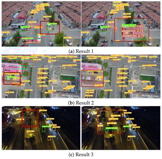 Target detection using the trained network structure is shown in Figure 6, where Figure 6a shows the experimental results of the baseline model YOLO v8n and Figure 6b shows the experimental results of the LW-YOLO v8 model. It can be seen that the detection accuracy of the LW-YOLO v8 model is better than that of the baseline model YOLO v8n in each category, in which the ten categories of pedestrian, people, bicycle, car, van, truck, tricycle, awning-tricycle, bus, and motor are improved by 0.055, 0.046, 0.015, 0.029, 0.043, 0.032, 0.023, 0.021, 0.053, 0.058. The value of IOU is set to 0.5, and the value of mAP@0.5 for the LW-YOLO v8 model is 0.363, which is higher than that of the baseline model YOLO v8n.
