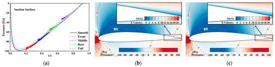 Due to the relatively stable lift coefficient and drag coefficient, as depicted in Figure 8c, there is little variation in the lift–drag ratio when grooves are placed at different locations on the pressure surface. These results exhibit higher lift–drag ratios greater that of the smooth airfoil, and indicate that the aerodynamic performance of the airfoil can experience a modest improvement when appropriately sized grooves are placed on any segment of the pressure surface. For grooves on the suction surface, owing to the smaller drag coefficient and larger lift coefficient, the airfoil lift–drag ratio can be significantly enhanced when grooves are positioned in the front and middle segments. The effects of placing grooves on the rear and tail segments of the suction surface, conversely, lead to a rapid deterioration in the airfoil aerodynamic performance, especially in the tail section. On the whole, the variations in the drag coefficient largely align with the trends observed in groove-induced drag reduction under adverse pressure gradients [37,38], where groove drag reduction rate becomes greater under mild adverse pressure gradients (Figure 2, Front and Middle sections of the suction surface), but deteriorates as the adverse pressure gradient approaches a strong magnitude (β = 2) (Figure 2, Rear and Tail sections of the suction surface). Due to the absence of significant pressure gradients on the pressure surface, the drag reduction effects observed in various segments are similar. In order to investigate the reasons behind the impact of grooves at different locations on the suction surface on the lift coefficient, Figure 9 compares the pressure distributions near the suction surface.