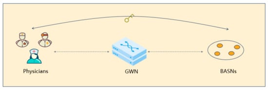 As shown in Figure 1, WBANs involve collaboration among medical staff, gateway nodes, and body area sensor nodes (BASNs). Medical staff or physicians are the users and controllers of the system. They obtain the patient’s physiological parameters by communicating with BASNs and performing the operation of diagnosis and treatment. As an intermediate device, the gateway node (GWN) bridges medical staff and BASNs and is responsible for data transmission, forwarding, and coordination. BASNs are equipped to collect patients’ biological data, including heart rate, blood pressure, body temperature, etc., while allowing medical staff to access these data in real time. In addition, BASNs can receive instructions from medical staff to perform corresponding operations as needed. Medical staff can rapidly assess the patient’s physical condition via this network topology model and perform corresponding medical operations.