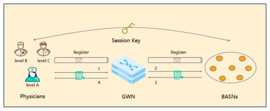 In the registration phase, users and BASNs register at the gateway, which corresponds to the registration process in Figure 2. At the same time, the gateway sets the user’s fine-grained authentication parameters according to the user’s occupation level and type in order to prepare for subsequent fine-grained authentication between users and BASNs. At the end of registration, the physicians (BASNs) retain real-time fine-grained authentication parameters (resp. secret value), and GWN stores the identity of BASNs.
