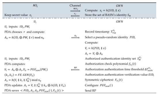 The registration phase comprises the following: In the terminal of the GWN, the user and BASN need to complete the registration of identity information and receive authentication parameters in order to be ready for future identity authentication and key agreement. Specifically, the registration phase includes the registration of the BASN and users.