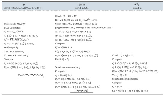 L1: Firstly, enters the identity and password . Secondly, PDA uses the physically unclonable function to verify the user’s identity. Specifically, PDA computes and . Thirdly, PDA compares whether is equal to ; if =, the user’s identity can be verified. Then, it proceeds to step L2 to continue the execution; otherwise, will add 1 to the value of automatically when the user tries to enter another again for the login. If the value exceeds the preset maximum value, the session will be terminated, and the user’s account will be frozen until re-registers.