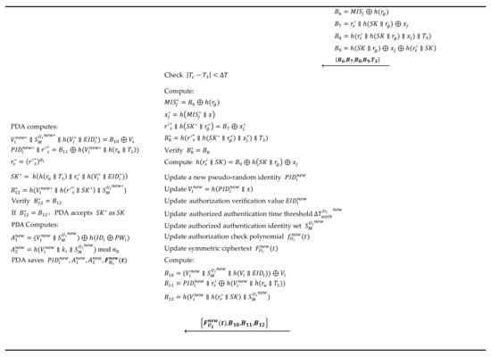 - R23: After receives RP, updates and calculates as follows: At first, inputs to PDA, and PDA computes . PDA then uses to compute the following: , . After that, PDA updates secret value . Finally, PDA stores a series of values: .