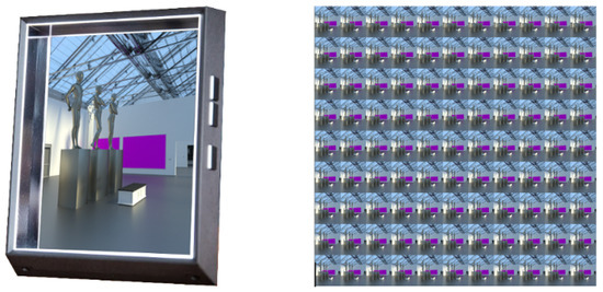 First, in terms of image data, the light field images used for testing in this article came from the public database MPI-LFA (Max Planck Institut Informatik Light Field Archive) database [31]. The display device used in this article’s experiments is a Lookingglass, as shown on the left side of Figure 2. The images in MPI-LFA need to be cropped and spliced into a quilt array form that can be used by the Lookingglass. One of the quilt array images is shown on the right side of Figure 2.