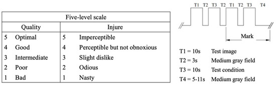 Next comes the test-scoring part. According to ITU standards, the rating scale for the subjective indicator system in the experiment refers to the five-level quality damage scale in the “ITU-R BT.2021-1 [32] Recommendation on subjective evaluation methods for stereoscopic three-dimensional television systems”. The display method of holographic visual materials in the experiment refers to the double excitation damage scale method (EBU method) in the “ITU-R BT.500-14 [33] Recommendation on subjective evaluation methods of television image quality”. The scale (left) and demonstration method (right) are shown in Figure 4.